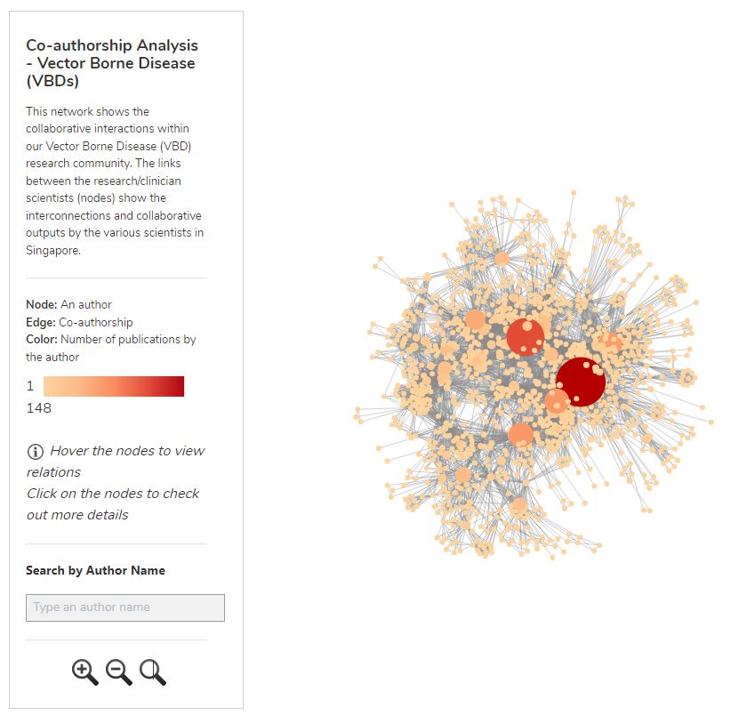 Co-authorship analysis - This examines collaborative interactions within domain-specific research communities. The connections between research and clinician scientists illustrate the network of collaborations and the collective research output within Singapore.